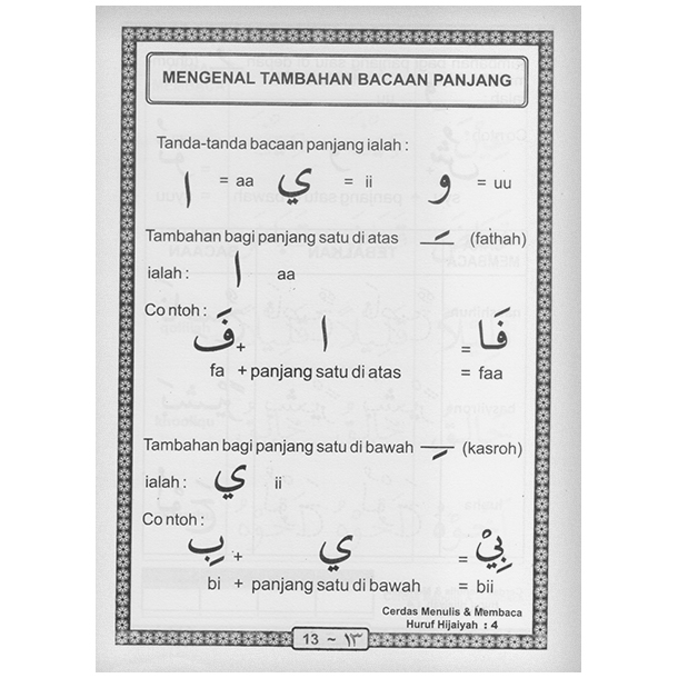 Cerdas Menulis dan Membaca Huruf Hijaiyah 4. Mempelajari huruf Hijaiyah adalah syarat utama untuk membaca Al-Quran. Karena huruf-huruf tersebut menjadi dasar pembentukan kata dan kalimat dalam Al-Quran. Dalam Al-Quran, huruf-huruf Hijaiyah tidak dipisahkan, tetapi saling berhubungan. Ada beberapa karakter Hijaiyah yang bisa disatukan dan dipisahkan. Anda harus dapat membedakan dan membaca karakter yang bisa disatukan dan tidak bisa disatukan. Melalui seri buku ini, anak-anak akan diajak untuk mempelajari cara menulis dan membaca huruf Hijaiyah.