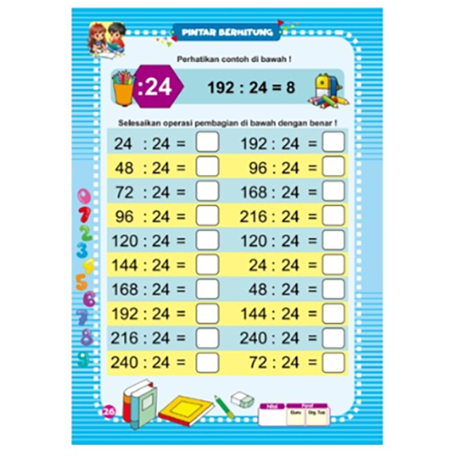 Buku Pintar Berhitung ini dirancang khusus untuk anak-anak TK dan PAUD, membantu mereka mengenal dan mempelajari konsep berhitung pembagian dengan cara yang mudah dan menyenangkan. Buku ini adalah solusi terbaik untuk memperkenalkan anak Anda pada dasar-dasar matematika. Didesain untuk anak usia dini, dengan gambar dan ilustrasi lucu yang akan menarik perhatian mereka.
