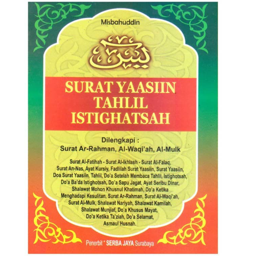 Buku Surat Yaasin Tahlil dan Istighotsah. Huruf Arab – Latin dan terjemahan Bahasa Indonesia. Dilengkapi surat-surat pendek, doa tahlil, dan sholawat